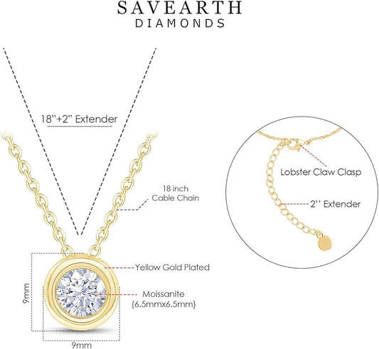 Necklace 18K Gold Plated Bezel-Set Solitaire, 6.5MM Moissanite Diamond - 0.9 CT