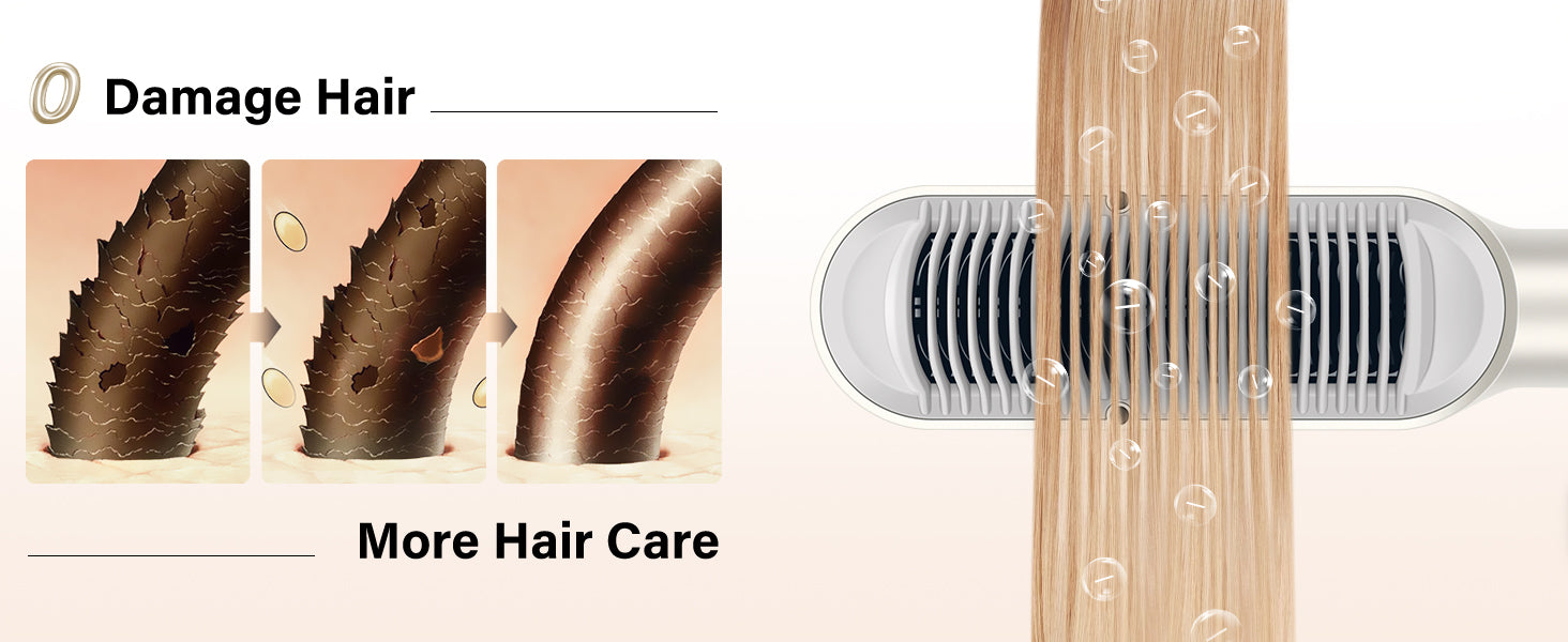 - Negative Ionic Hair Care - This hair straightener comb releases millions of negative ions simultaneously to deeply penetrate your hair for lasting protection and nourish the hair from the inside out, activating water molecules to repair hair scales, keeping your hair frizz-free and shiny.