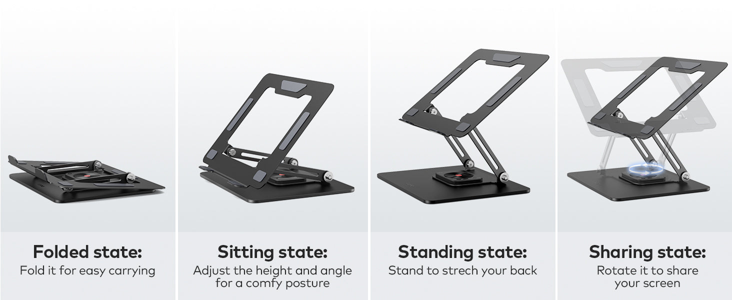- [360°Rotation]Featuring a 360° rotatable Two-axis connecting with the base, makes the 360°rotation more flexible, computer stand allows you to swivel your laptop to any angle, This give you plenty of flexibility in terms of working position. It will be especially useful for group projects or meetings. "