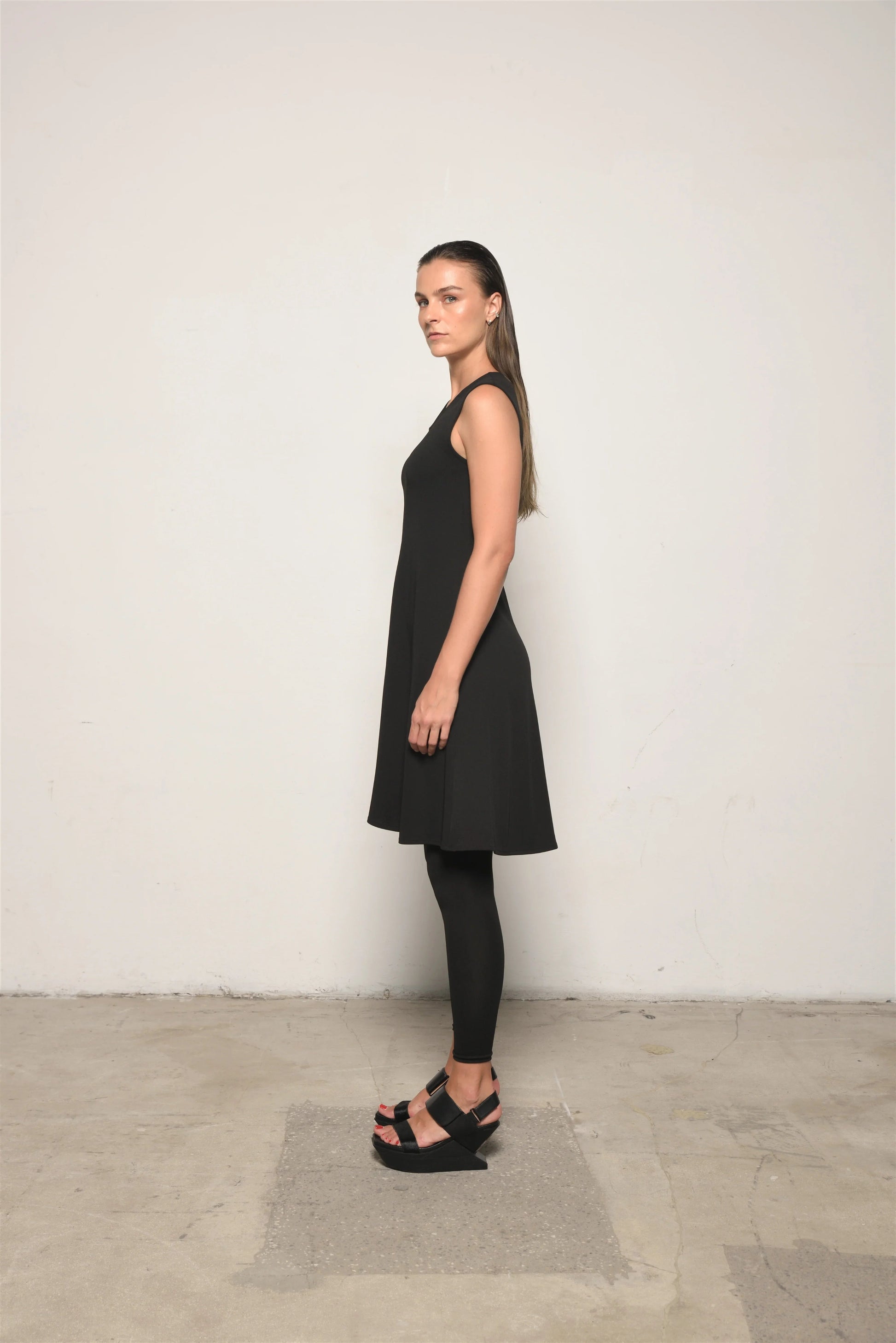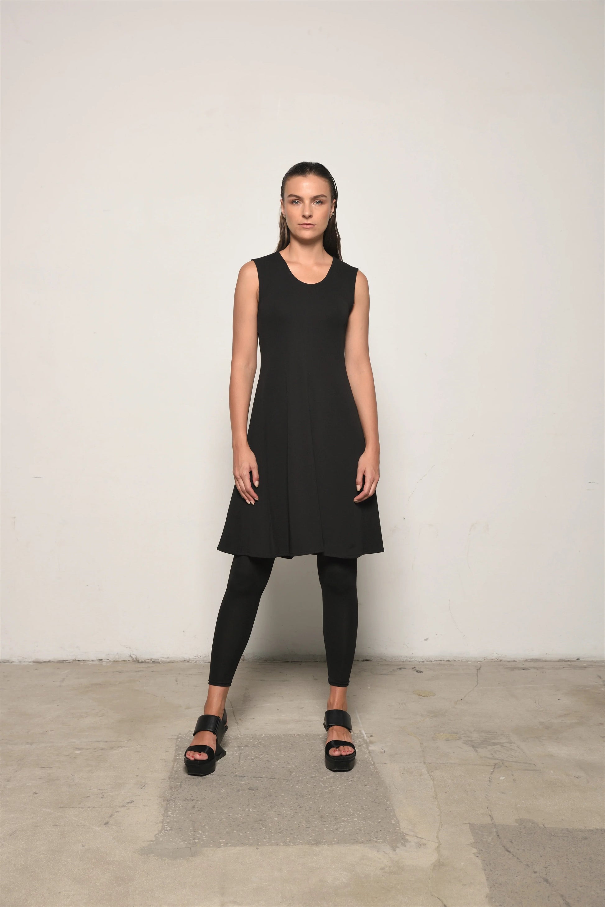 Effortlessly chic and endlessly versatile, this sleeveless black dress is a minimalist must-have. Designed with a flattering A-line silhouette, it skims the body while offering freedom to move. The soft scoop neckline and knee-length hem make it perfect for layering or wearing solo.
