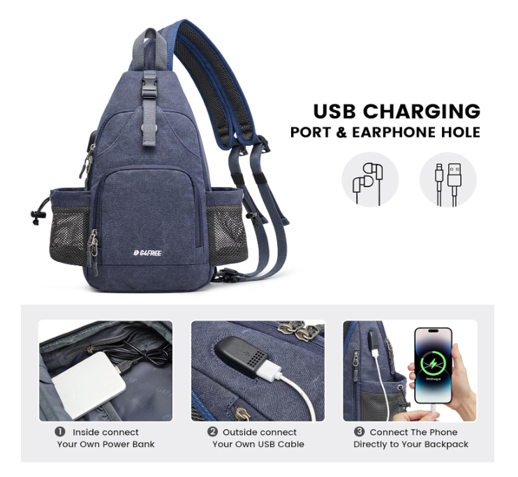 - USB Port Design & Earphone Hole - With a built-in USB charger port outside and a charging cable inside the sling bag, this travel crossbody bag offers you a more convenient way to charge your phone while walking. Please noted that this bag doesn't include power itself, usb charging port only offers easy access to charge. The earphone hole on the front pocket is convenient for enjoying the music.